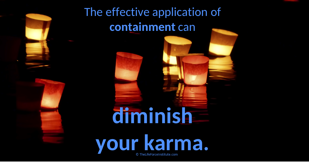 Containment can be an extremely effective tool to assist you in diminishing your karma or reducing the aspects of causality in your life. To apply containment, pause for a minute to consider your different courses of action. Then contemplate the potential repercussions or implications of your ideas or actions. The judicious application of containment can result in a happier life with less karma.