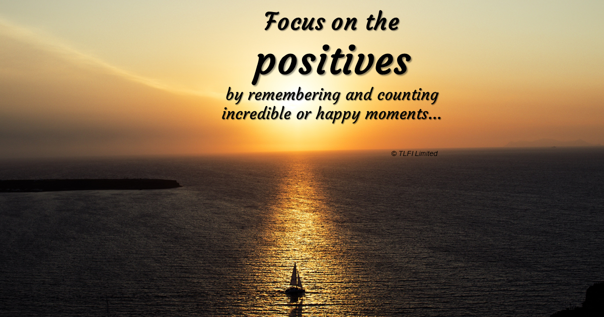 Elevate your state of mind by making a purposeful undertaking to seek out the positive situations in life. If you require some assistance to focus on the positives, make an effort to remember or count acts of kindness, happiness, or enjoying the incredible moments in your life.
