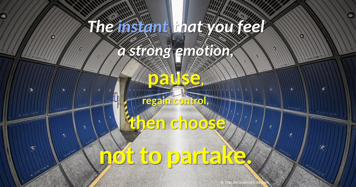 The instant that you feel a strong emotion building, pause so that you can regain control. This will help you to not fall into the pending assault of feelings, thoughts and sensations. Once you have briefly paused the reactionary processes of your mind, the most effective choice is not to get involved. In effect, you do not want that emotion or that emotional reaction to be a part of you. Using activities based on Life Force Cognition can help you to bring greater control to your mind, assisting you to handle strong emotions.