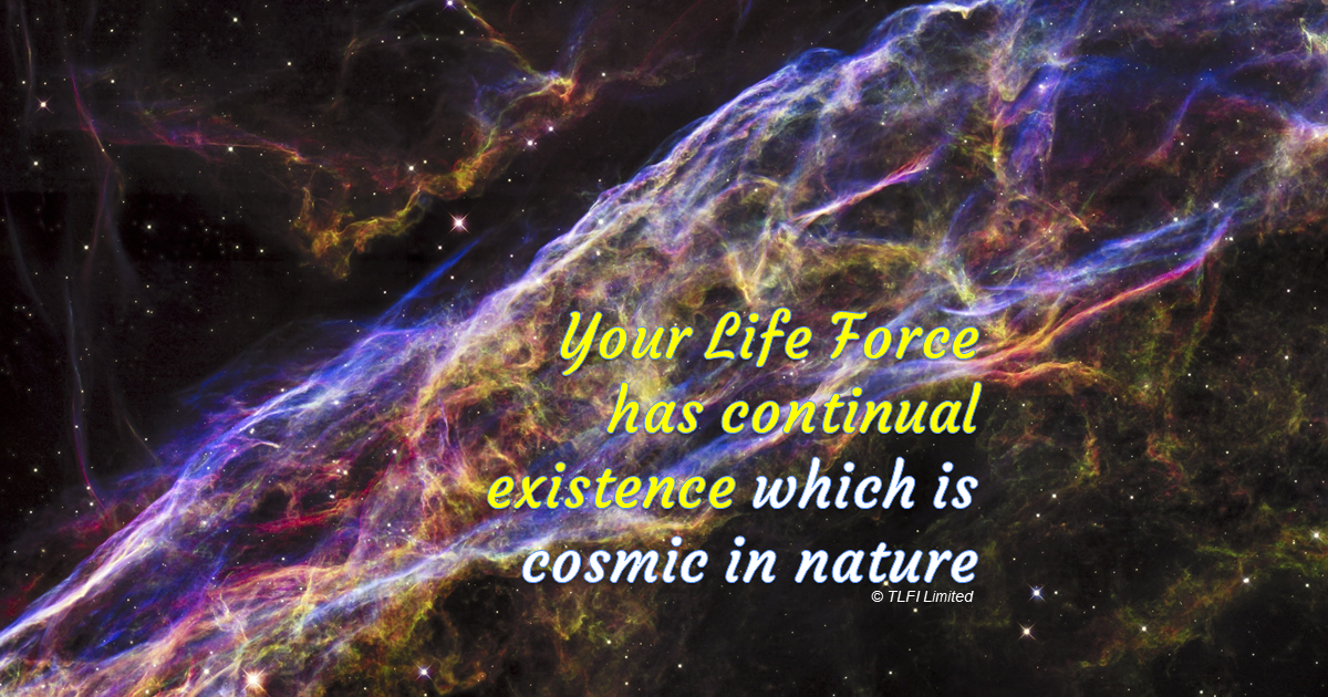 The living energies which are present in all living things form the basis of life. Your Life Force has continual existence being formed of the energy which is cosmic in nature. Realise you are Life Force, made of the universe.